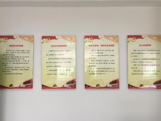 黨員活動(dòng)室在醒目位置特設(shè)主題教育墻,包括黨旗、入黨誓詞、黨員義務(wù)和權(quán)利;顒(dòng)室內(nèi)有8個(gè)宣傳展版,內(nèi)容包括組織架構(gòu)圖、黨委委員崗位職責(zé)、紀(jì)委委員崗位職責(zé)、民主生活會(huì)組織生活會(huì)制度、“三會(huì)一課”制度、民主評(píng)議黨員制度、發(fā)展黨員工作流程圖和黨員活動(dòng)日制度。活動(dòng)室還配備了報(bào)刊書架,擺放黨員學(xué)習(xí)書刊雜志等。