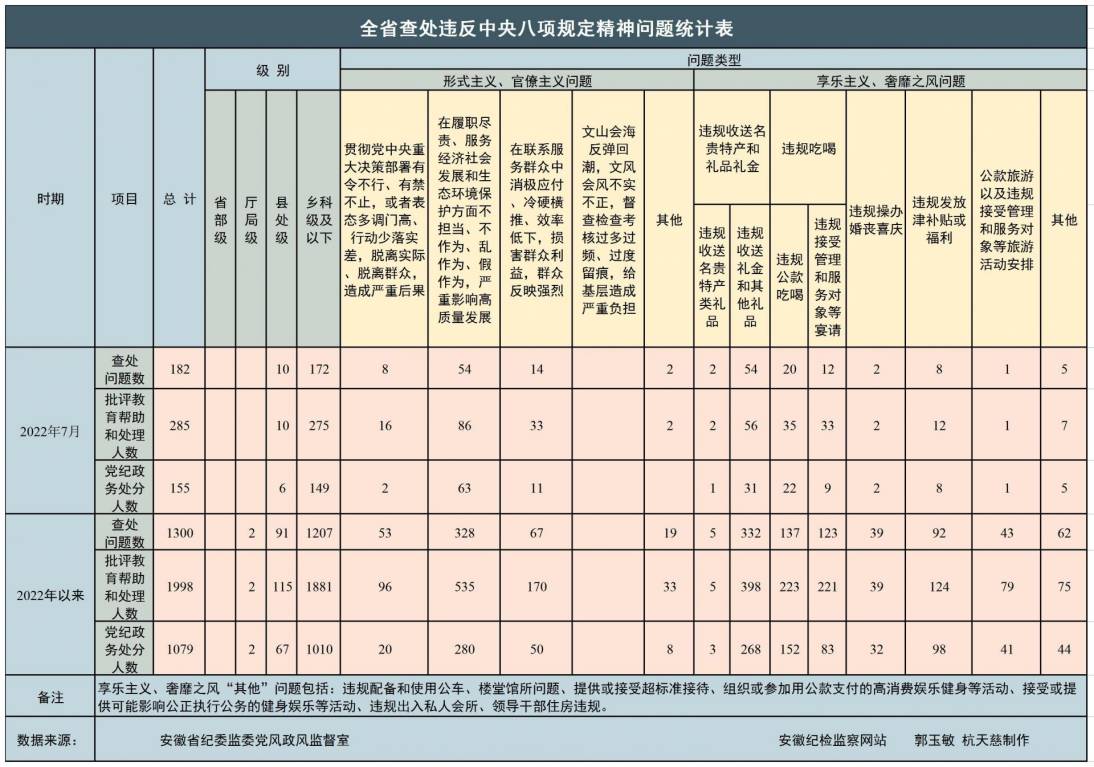 2022年7月,全省紀檢監(jiān)察機關共查處違反中央八項規(guī)定精神問題182起,批評教育幫助和處理285人,其中給予黨紀政務處分155人,同比分別下降15.7%、2.1%、上升0.6%。